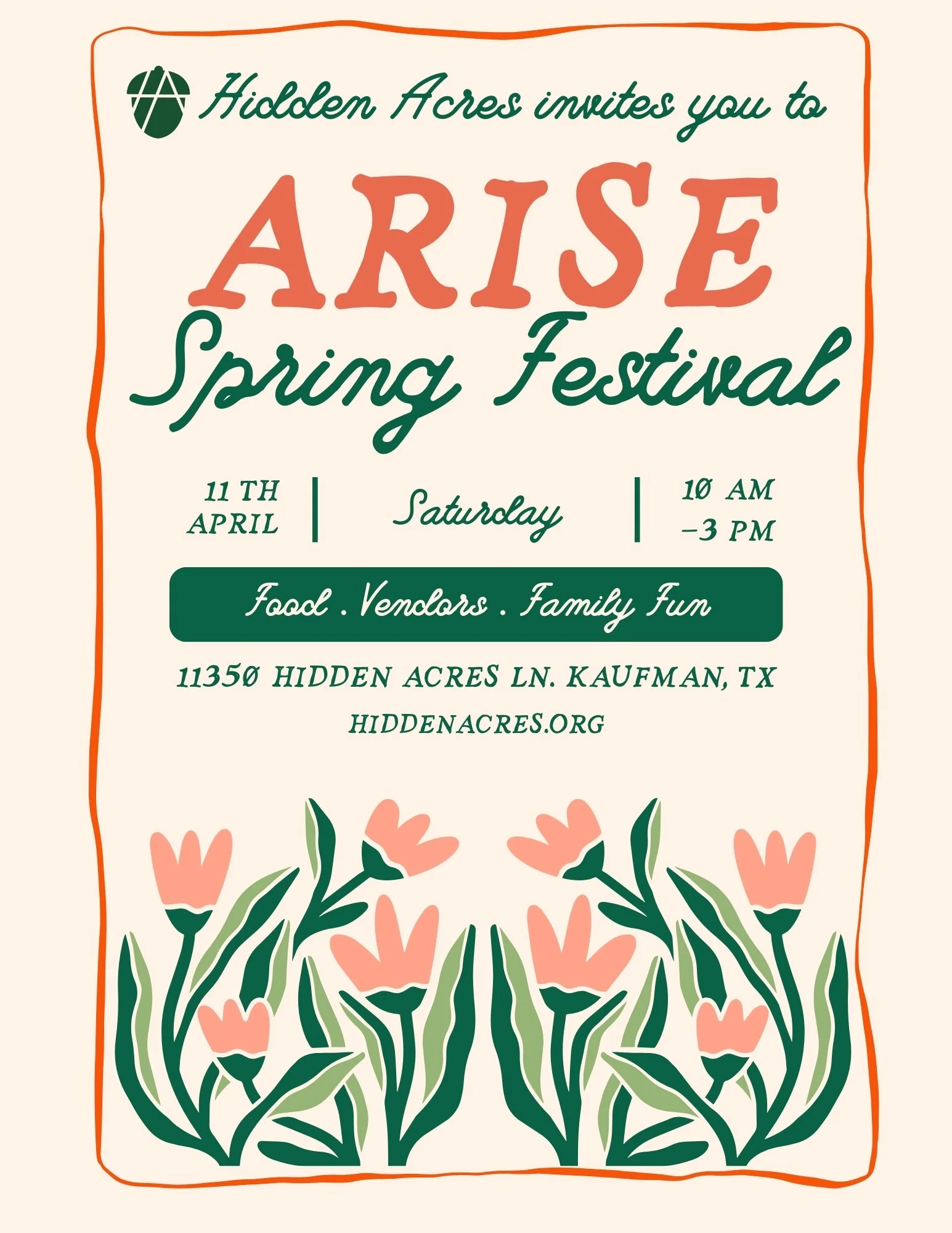 We invite you to partner with Hidden Acres as a vendor for the ARISE Spring Festival—a free, family-friendly community event designed to bring people together. This event is all about welcoming our community to Hidden Acres for a joyful day of connection, creativity, and family fun. We value our local makers and small businesses and believe your presence helps make ARISE a vibrant, meaningful experience. By joining us, you’re not only sharing your work—you’re helping spread the word, invite families in, and play a vital role in creating a memorable event that serves and strengthens our community.