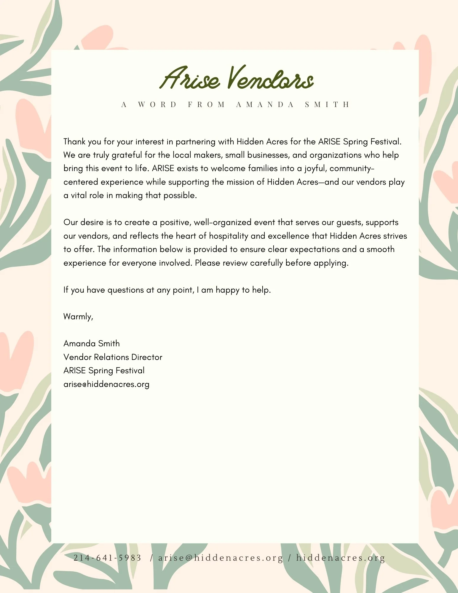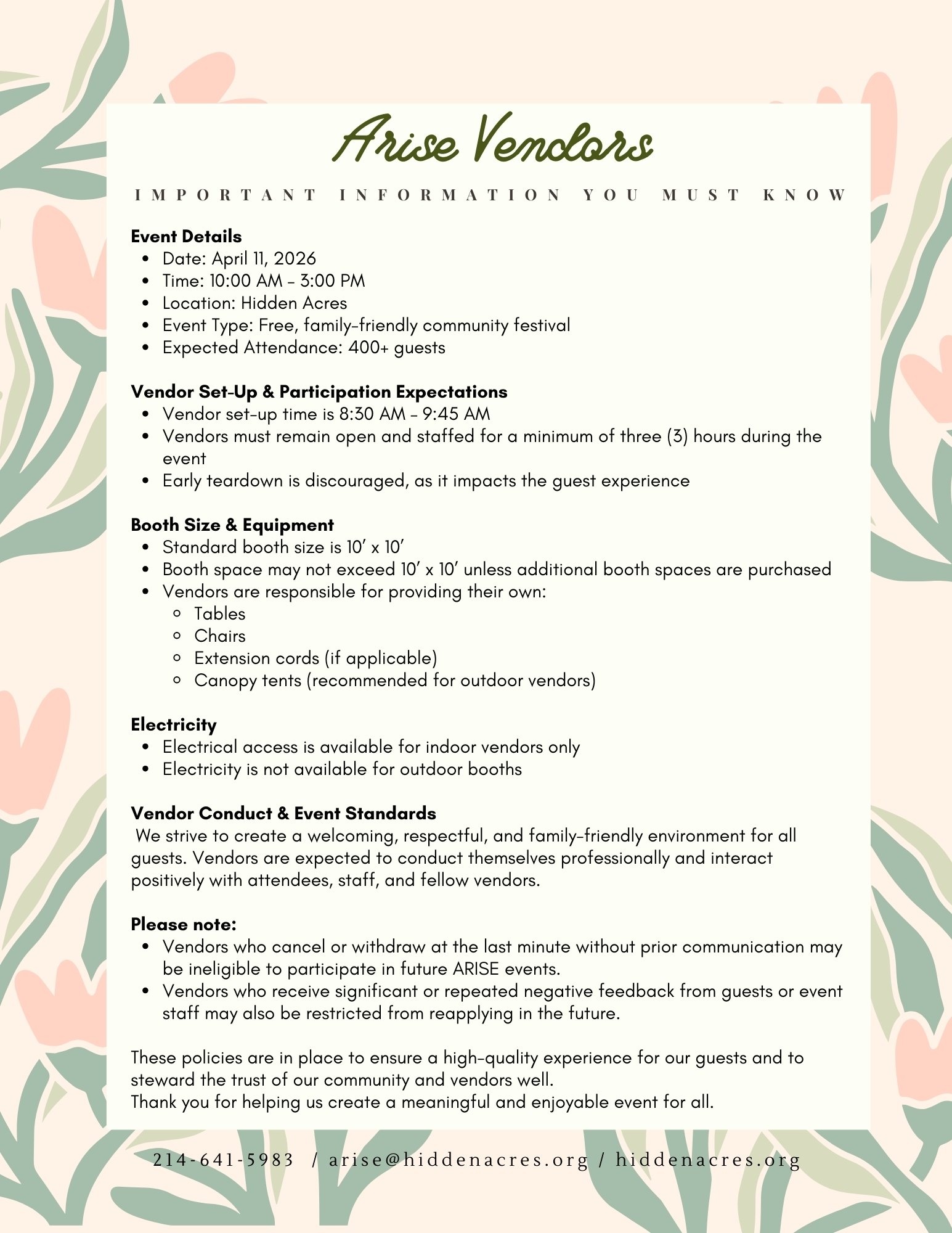 Thank you for applying to be a vendor at the ARISE Spring Festival. We are grateful for your interest and for the role you play in supporting families, local businesses, and the mission of Hidden Acres. Our Vendor Relations Director, Amanda Smith, will be in touch after reviewing your application to confirm whether a booth space is available.