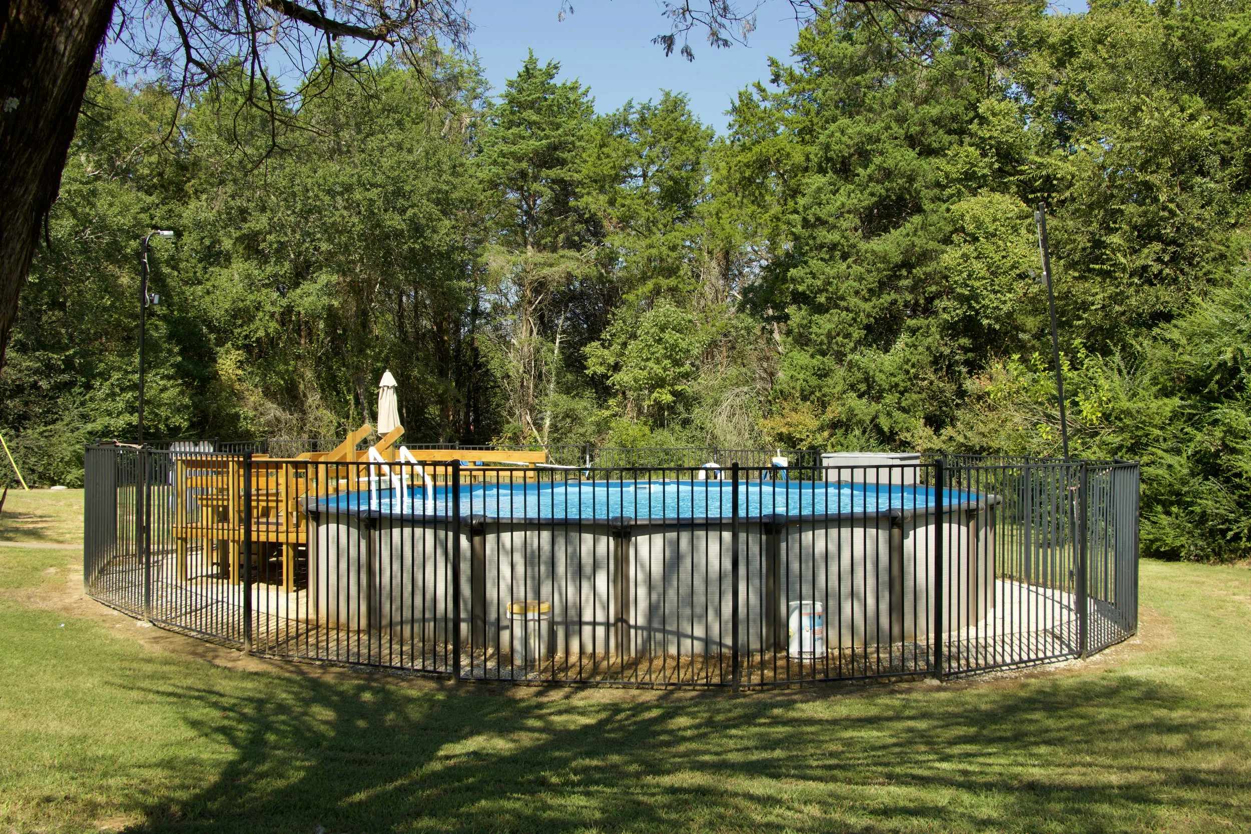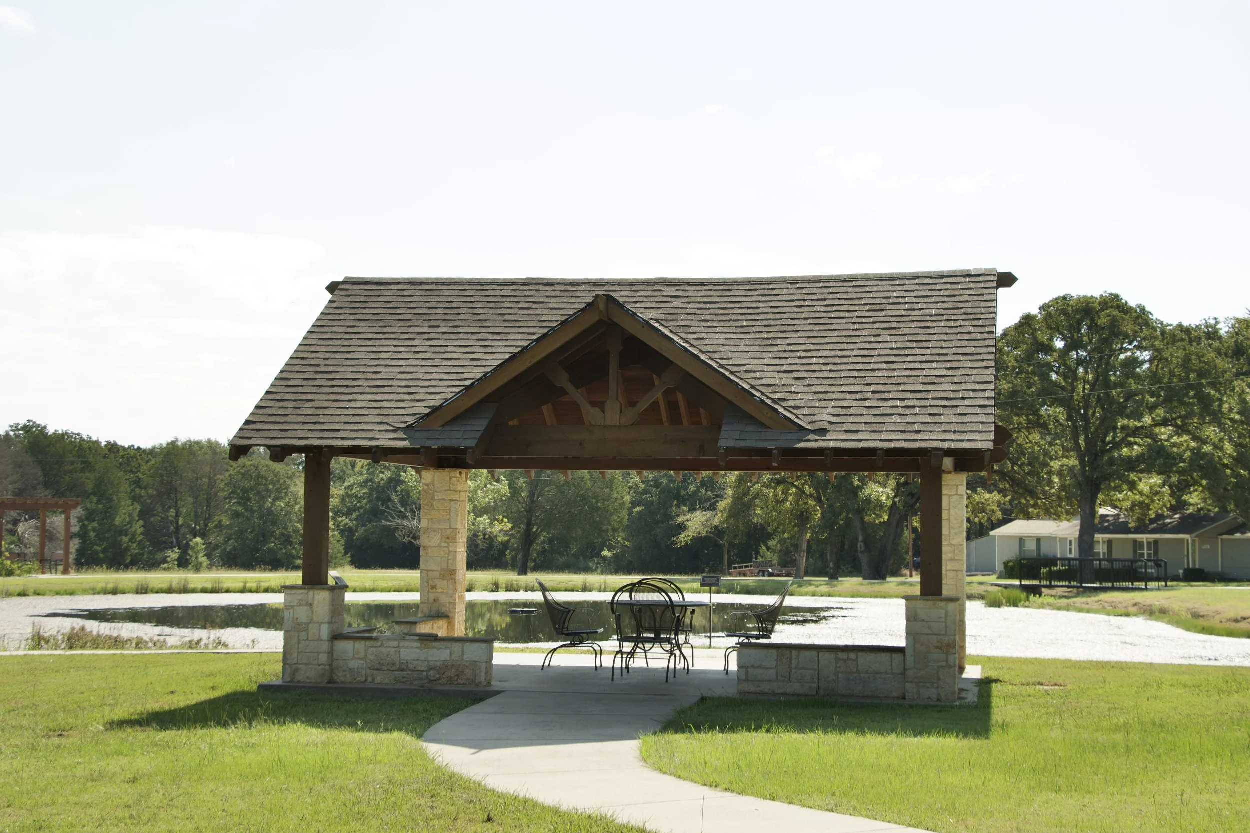 Outdoor Amenities: fire pit with seating, swimming pool, covered outdoor eating pavilion with picnic tables, and playground
