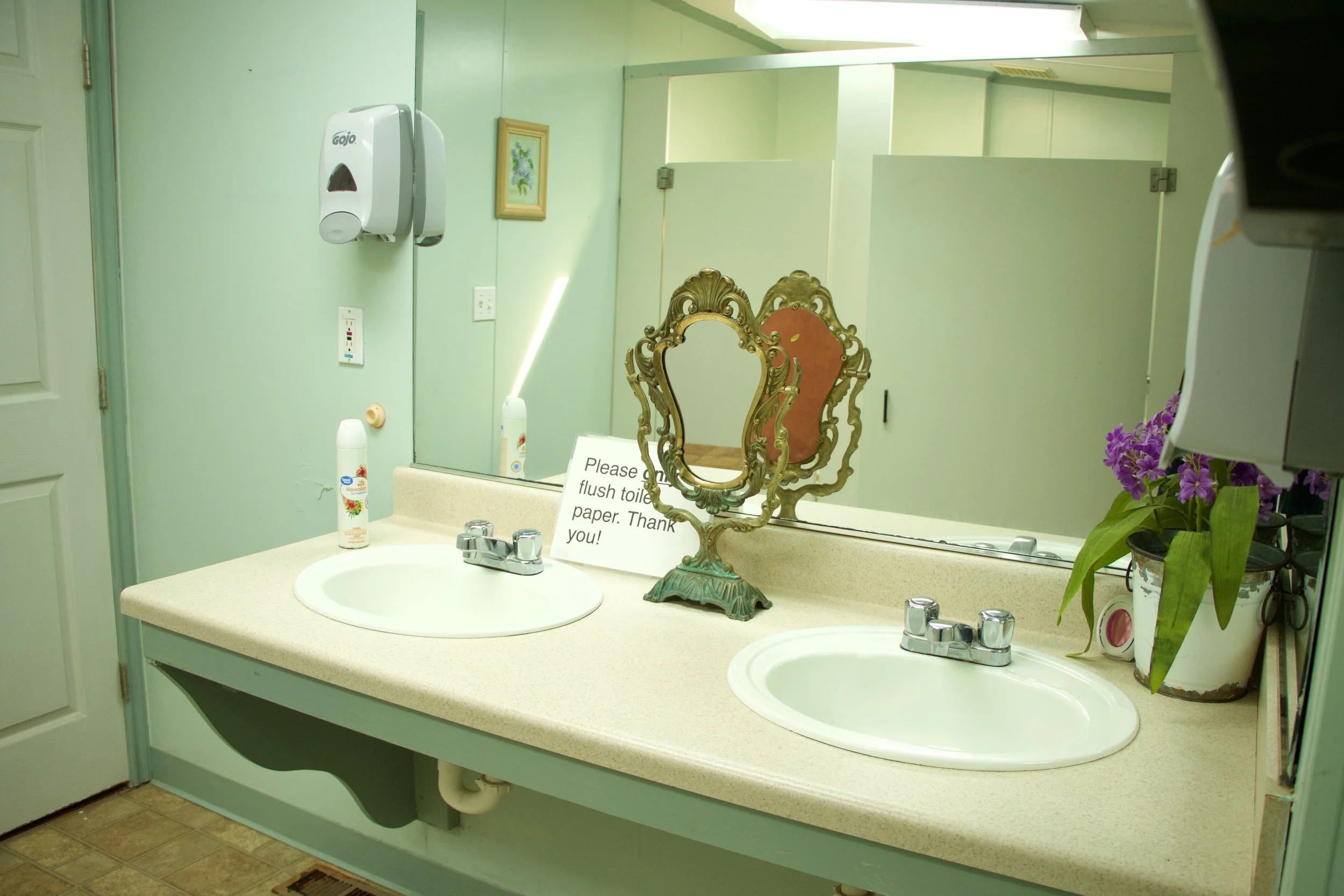 3 showers, 4 sinks, 3 toilets, and 1 urinal.