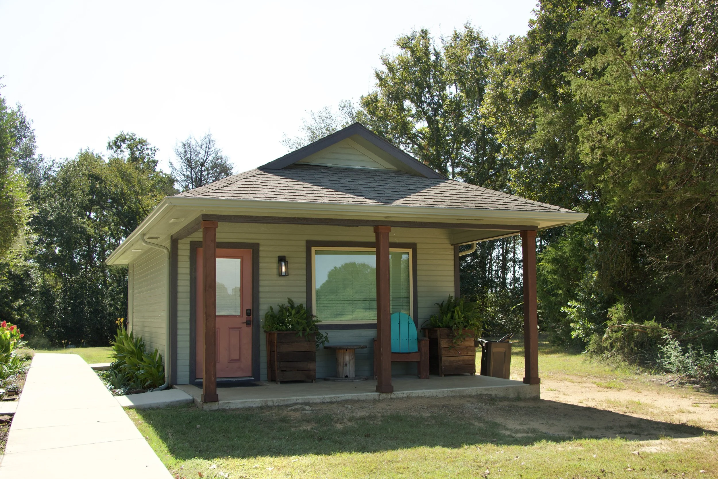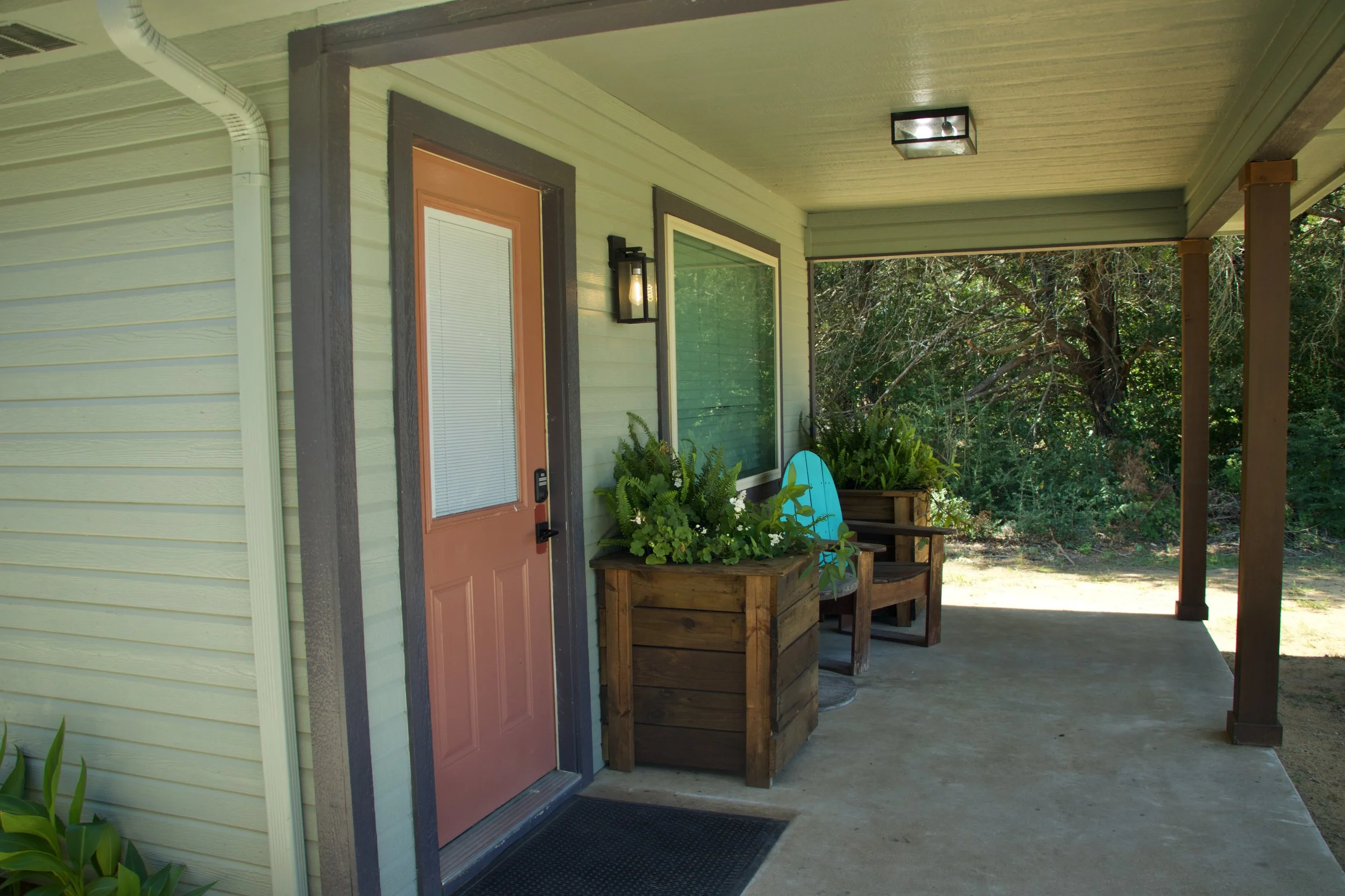 Small cabin with 1 full bed, 1 twin bed, and 1 full restroom.